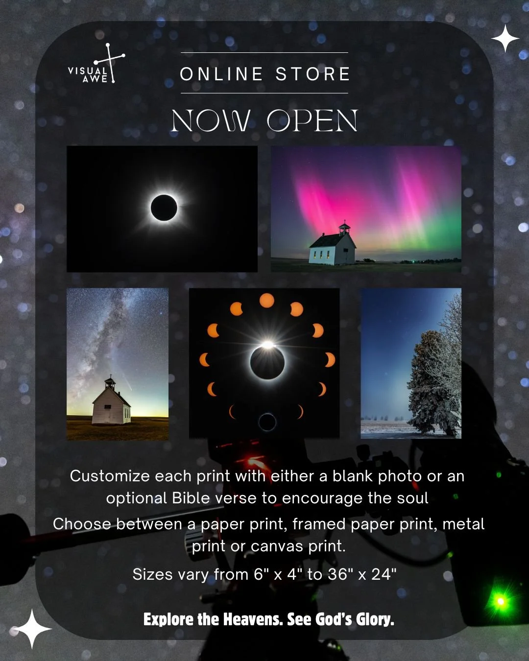 Visual Awe seeks to capture the glory of God, declared by the heavens, for all of us to enjoy. View my gallery to learn more!