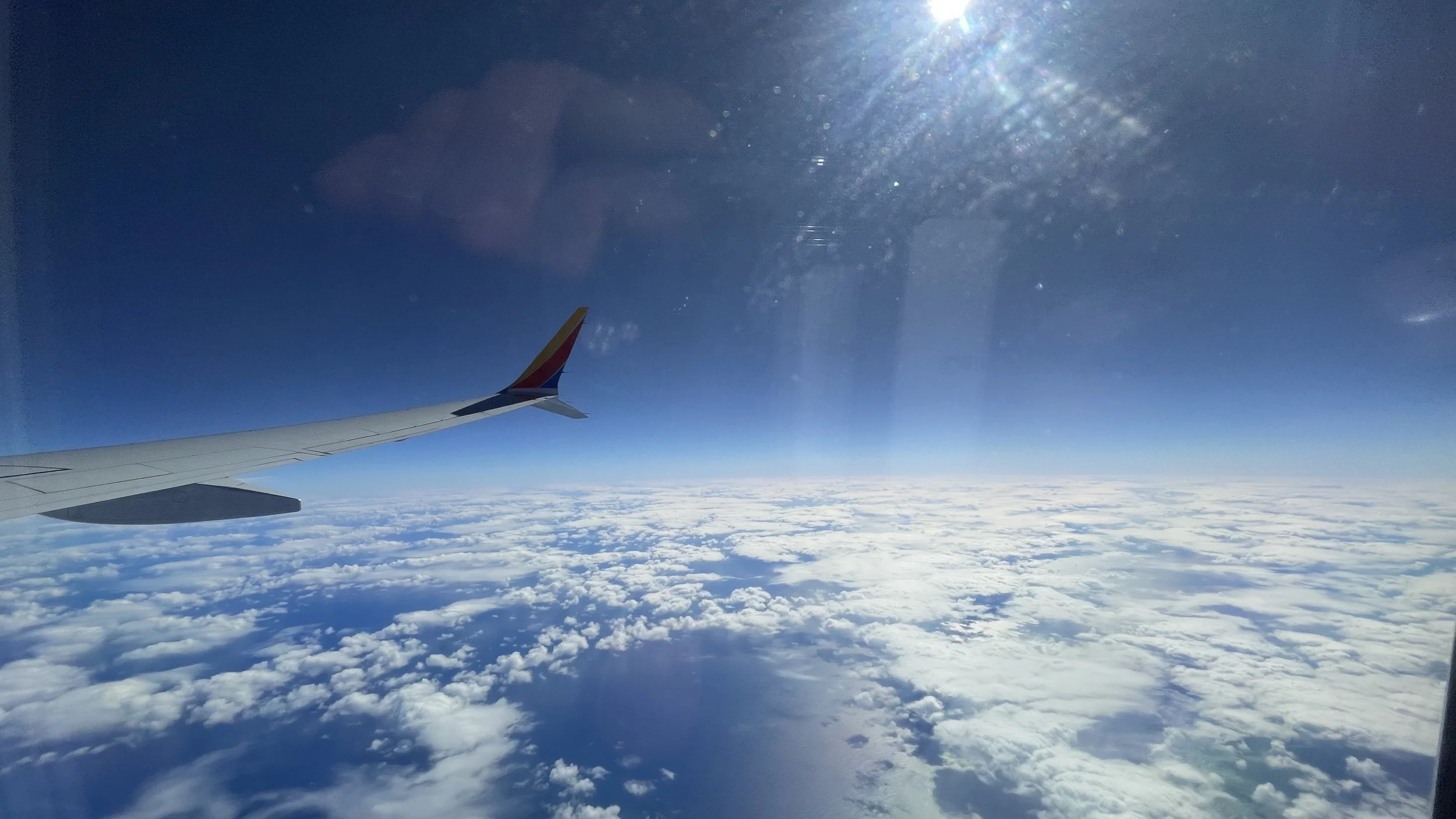 Sitting at 34,000 feet in altitude, you can observe the curve of the Earth as we fly over the Pacific Ocean.